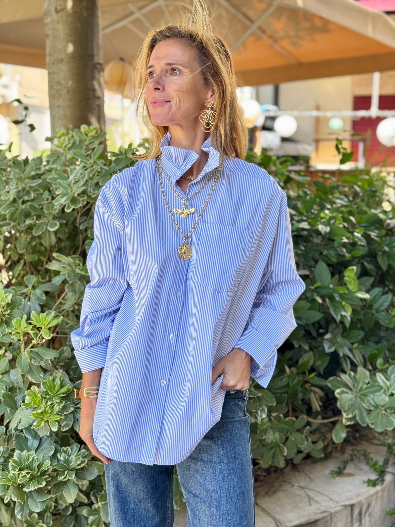 Jean droit intemporel, bleu, jambe longue et large.