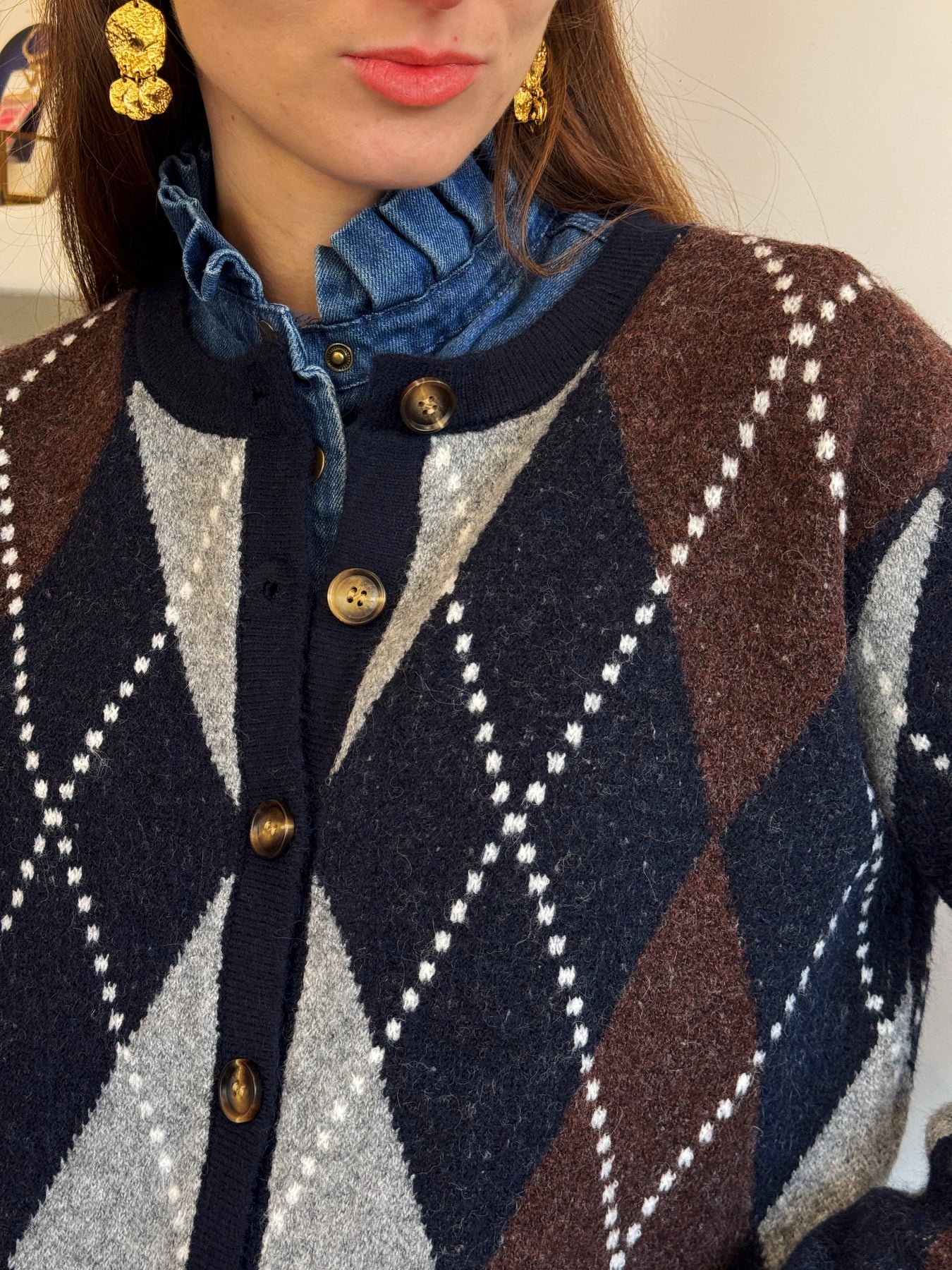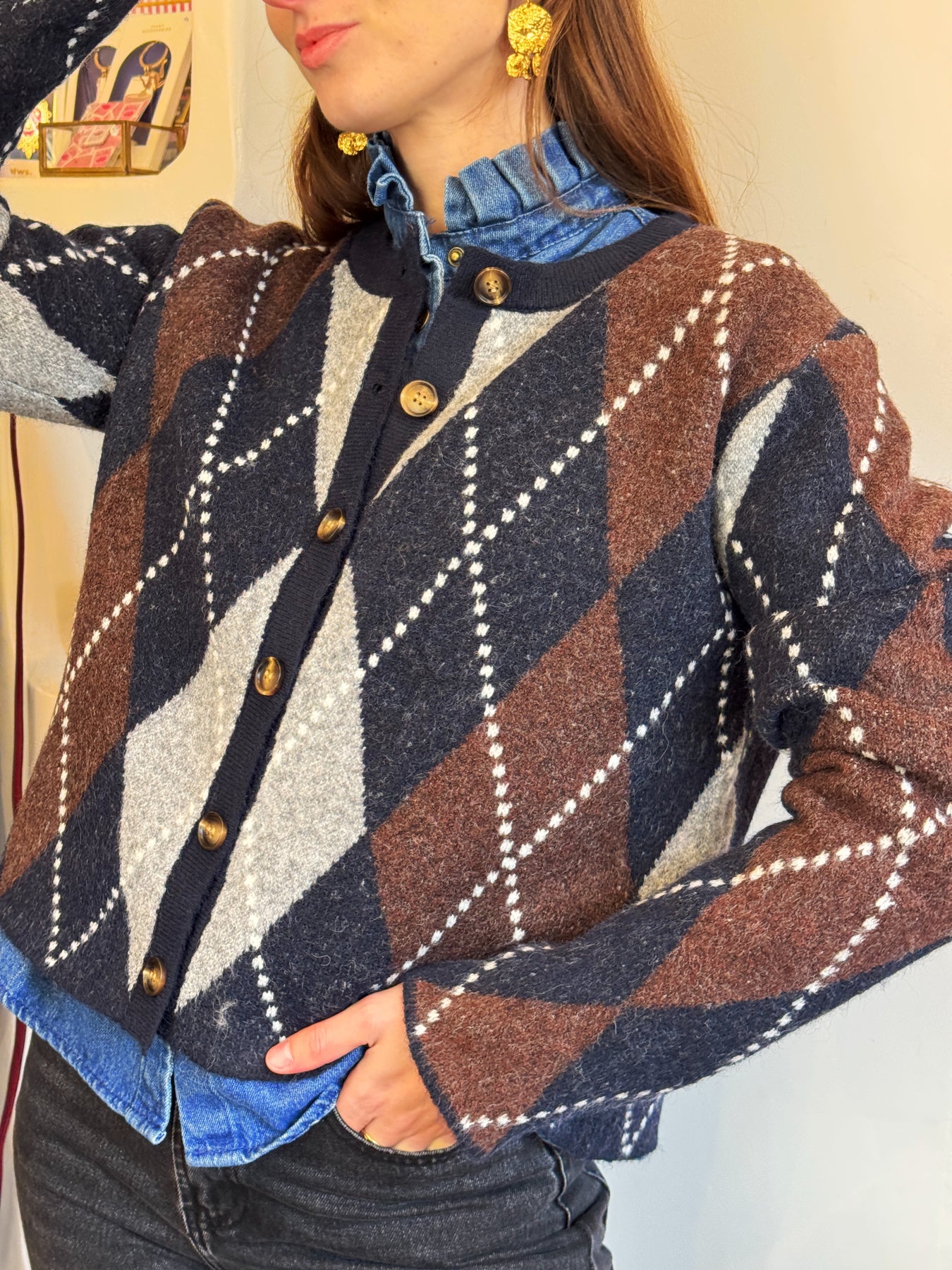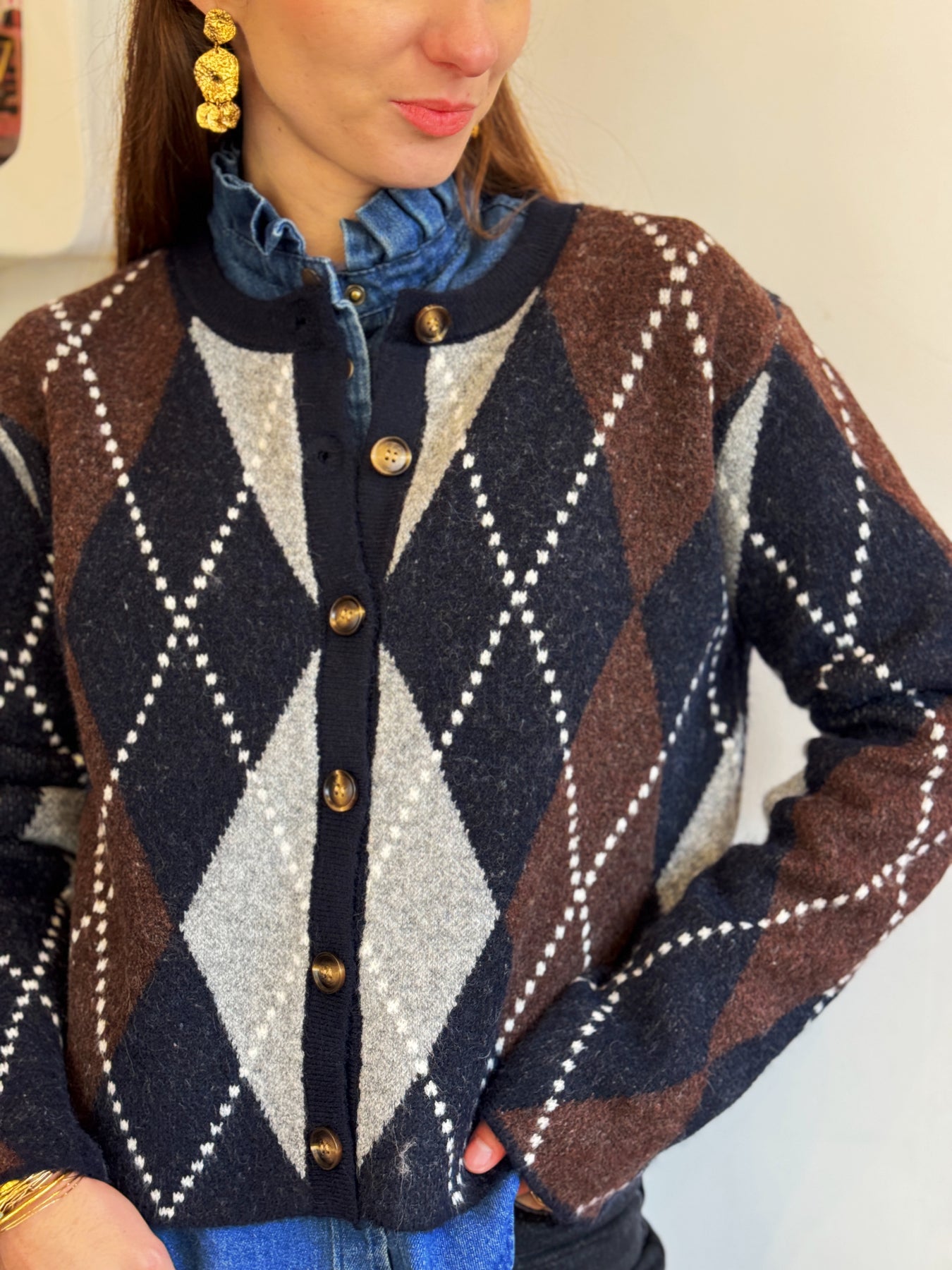 Pull boutonné jacquard marine et chocolat, coupe droite