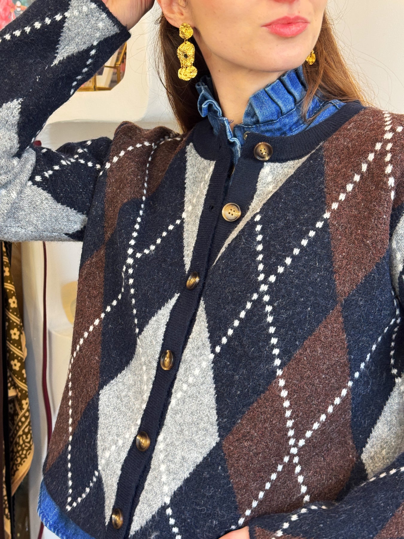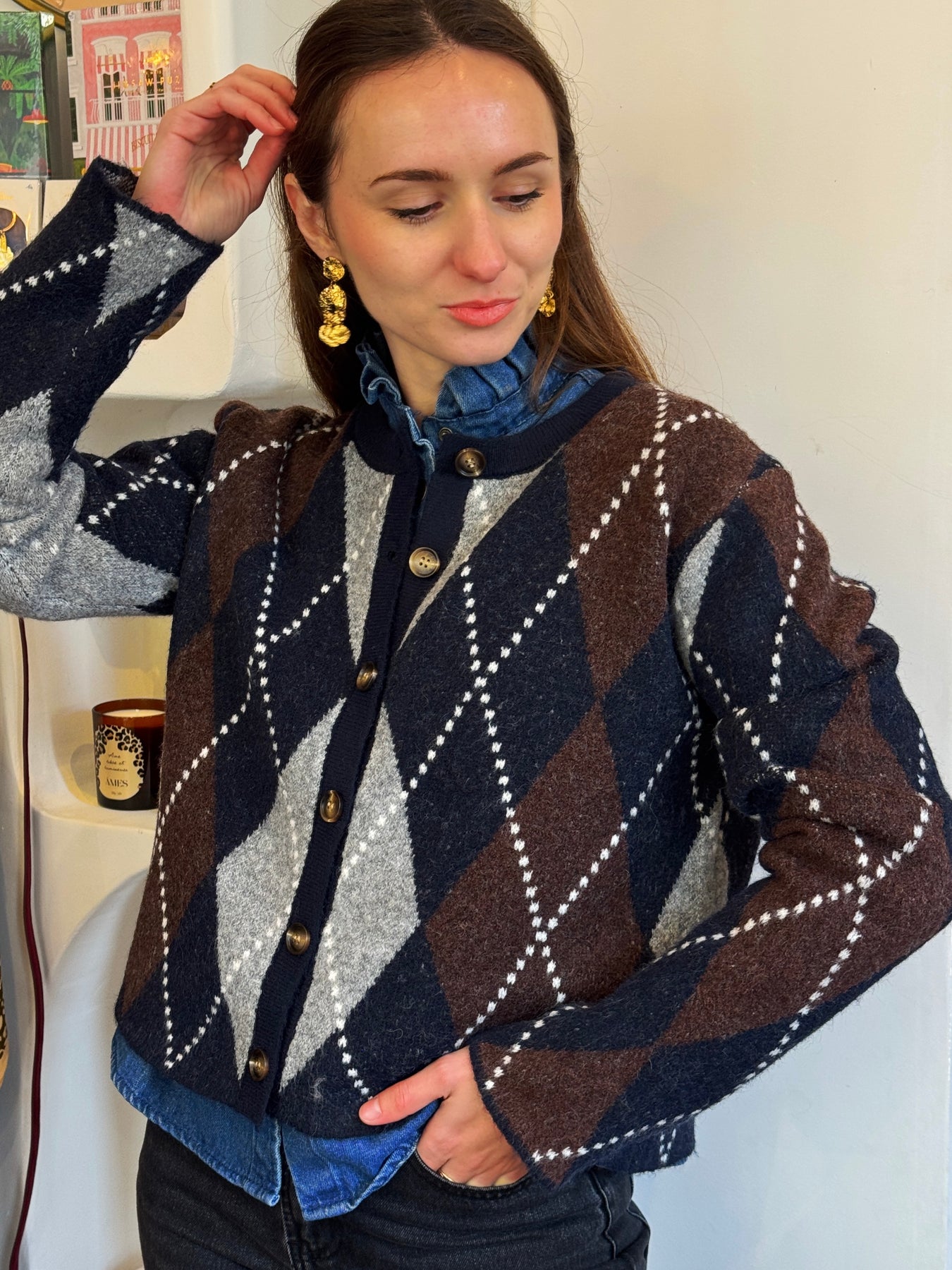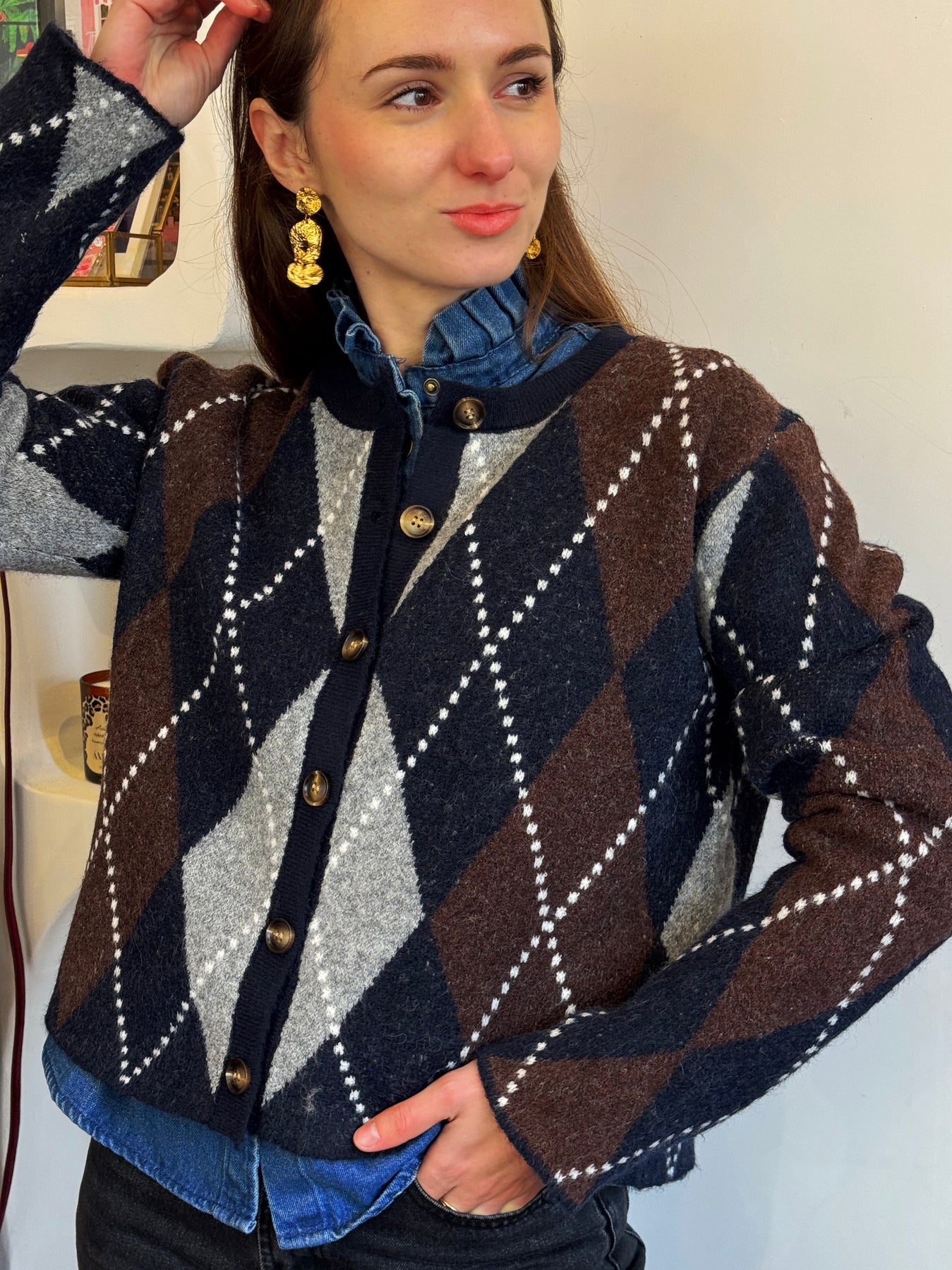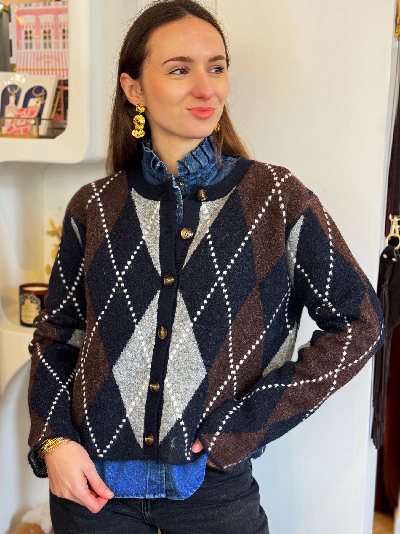 Pull boutonné jacquard marine et chocolat, coupe droite