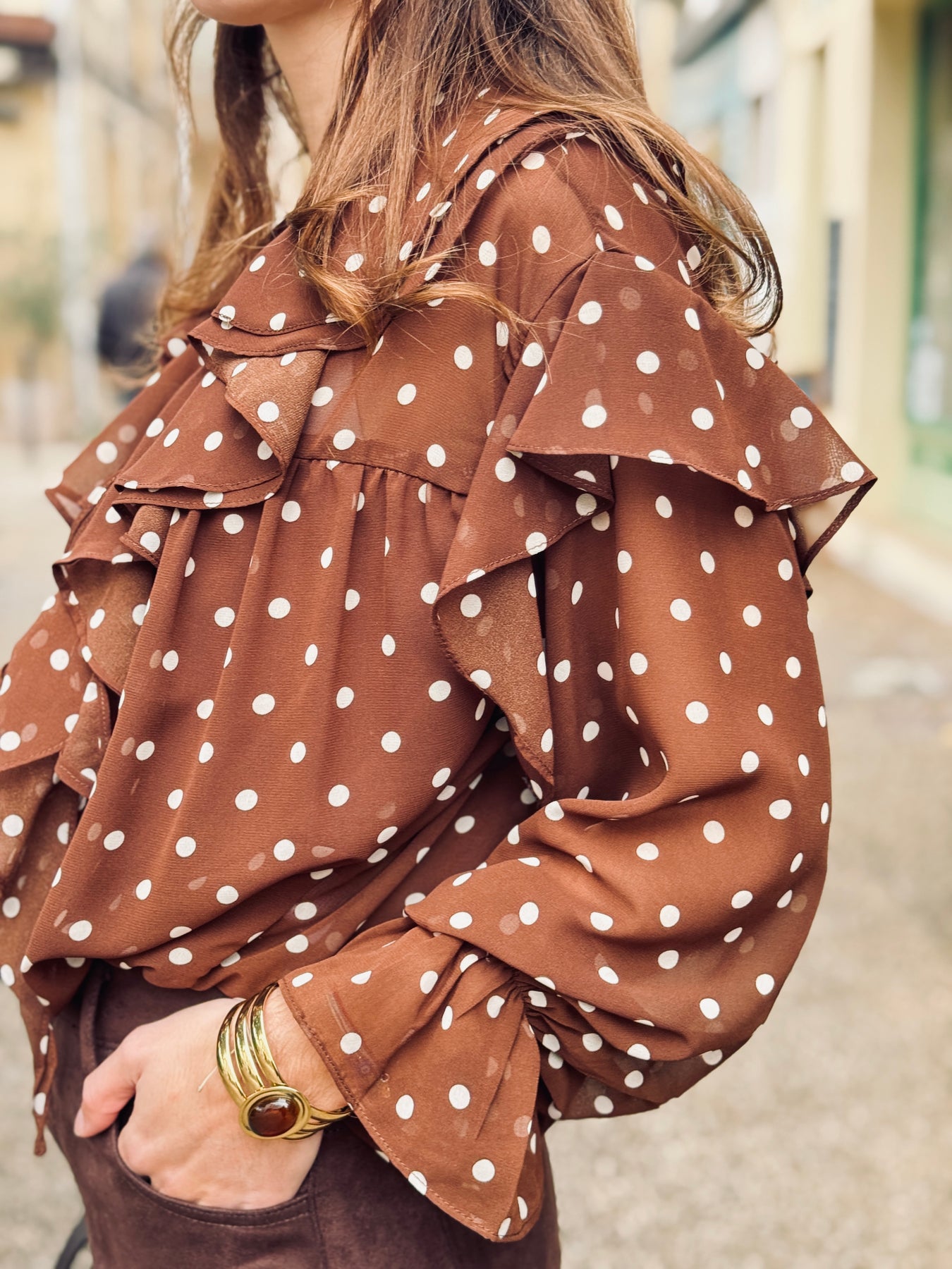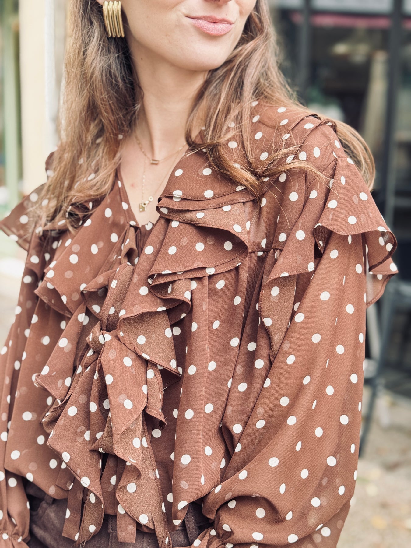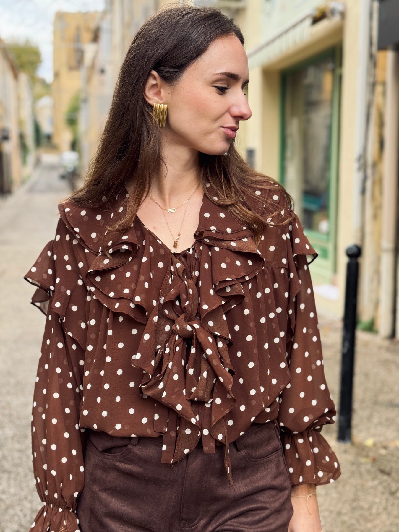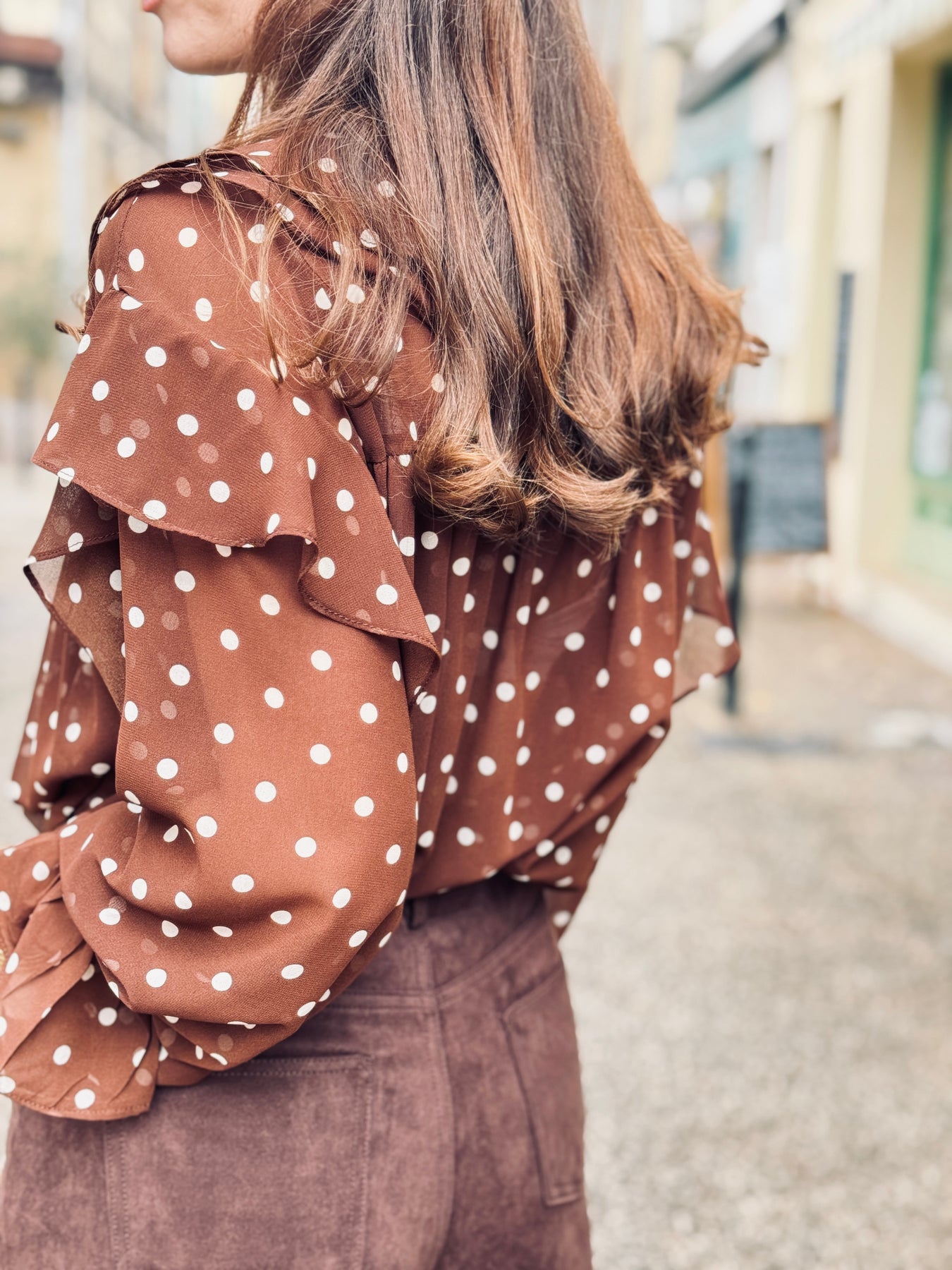 Blouse à pois marron chocolat, volants sur le devant et à nouer sur le col.