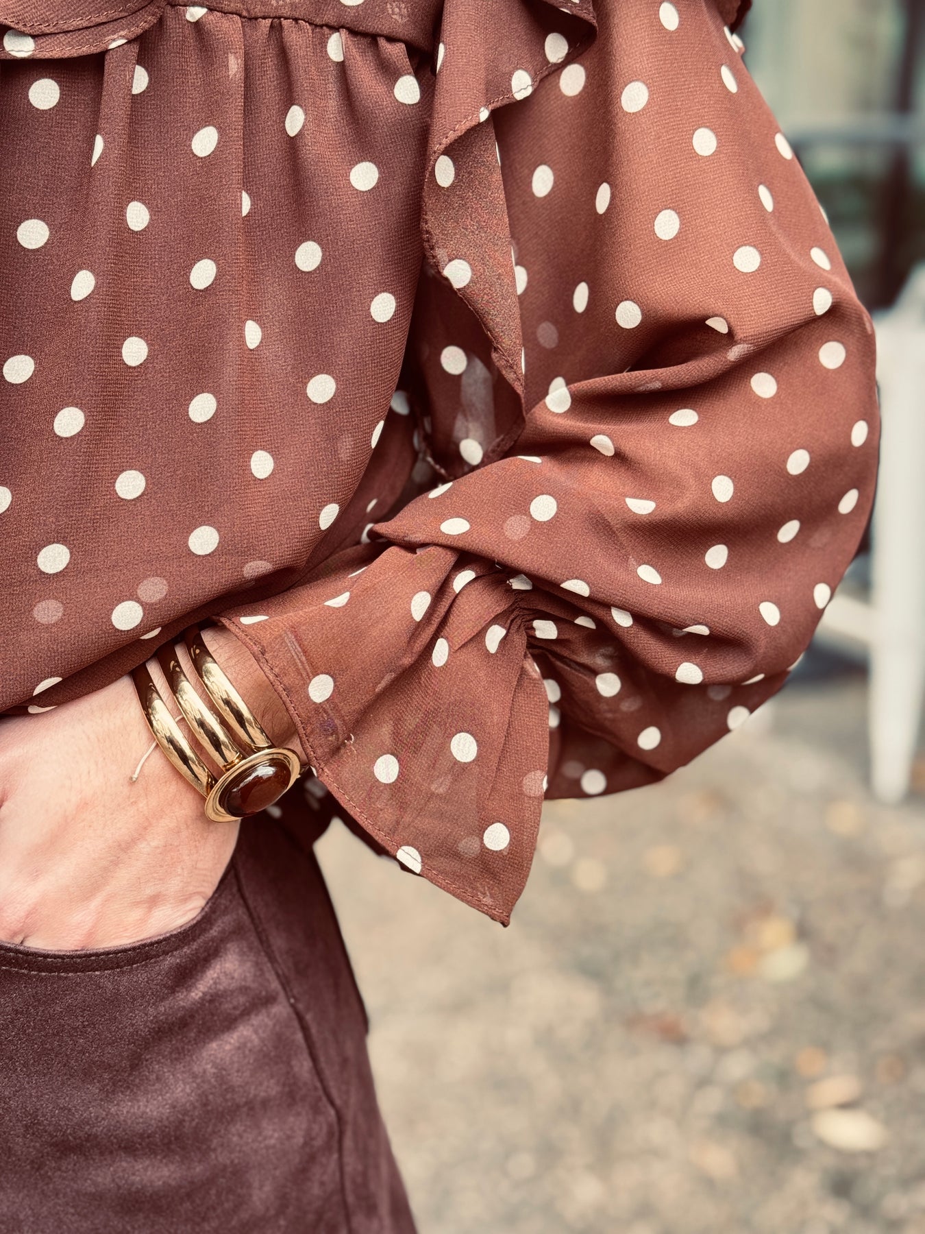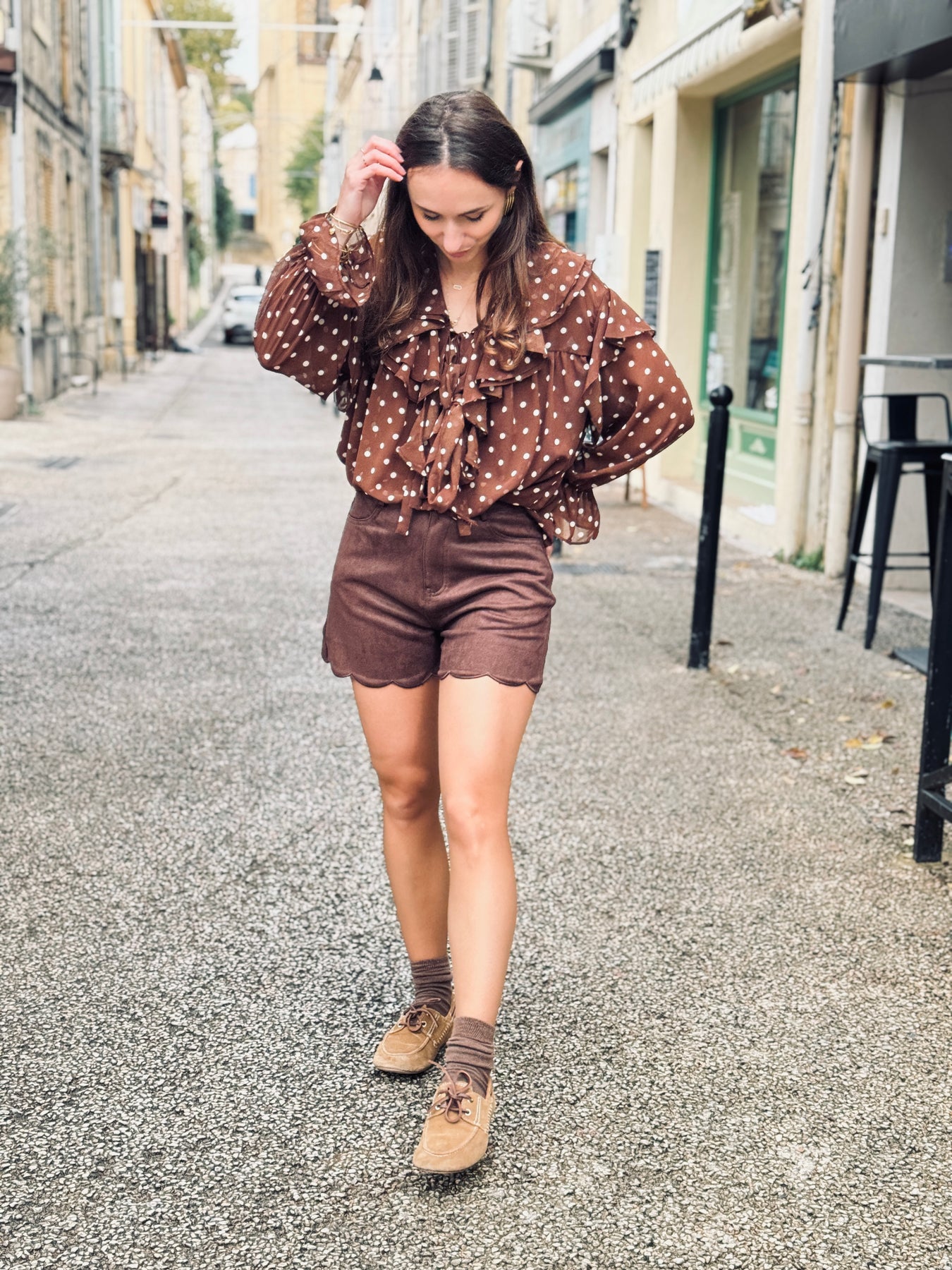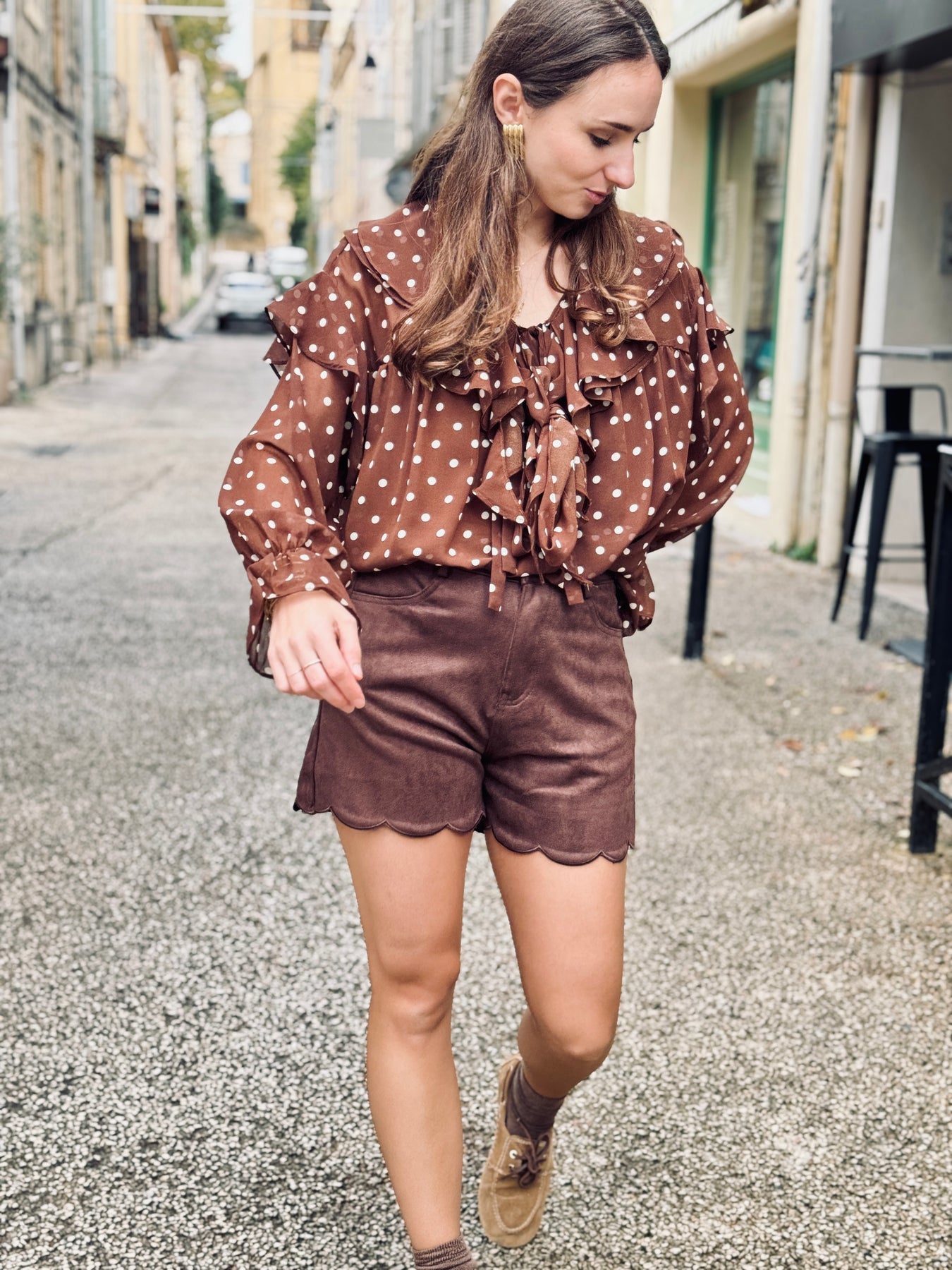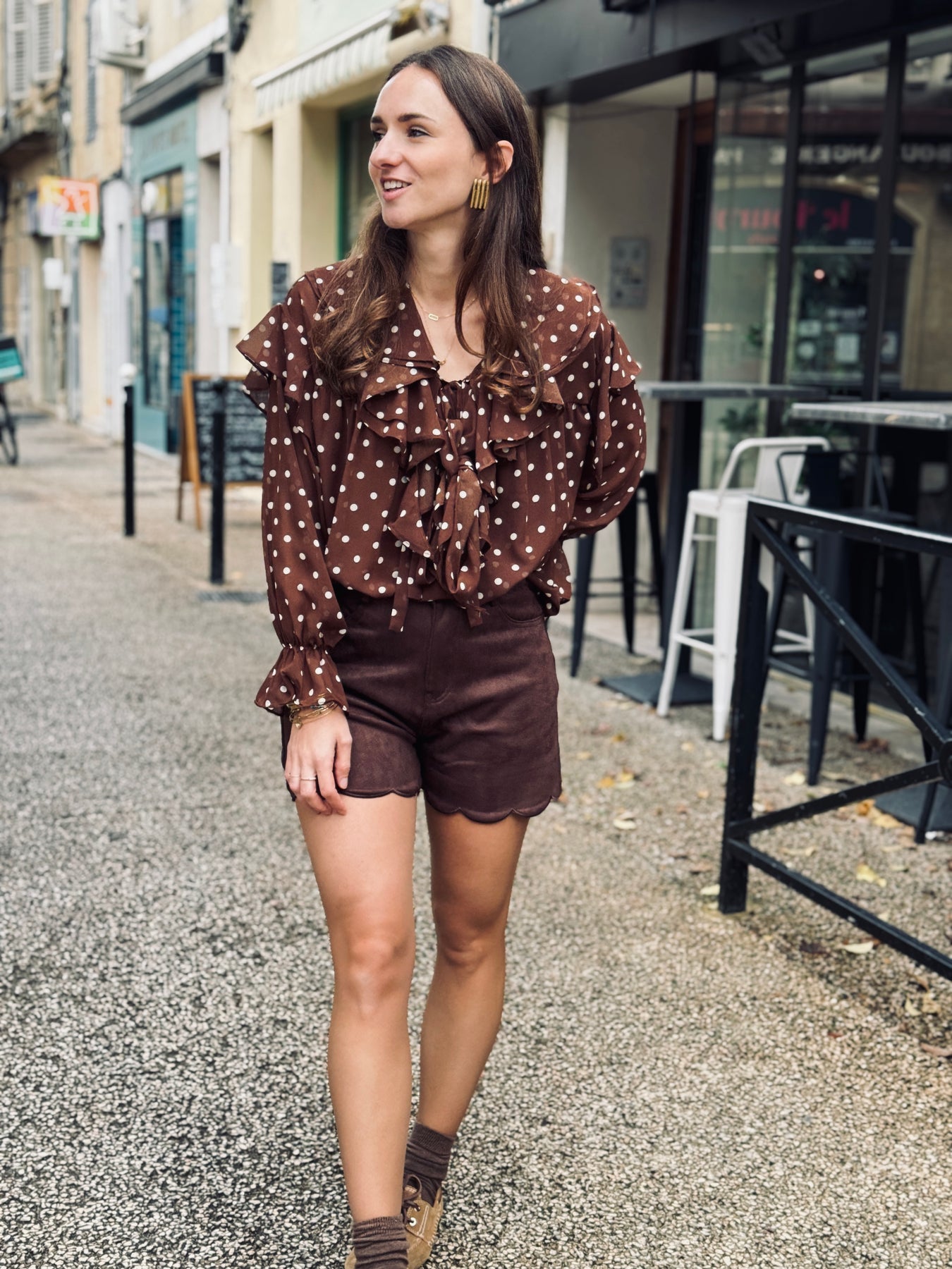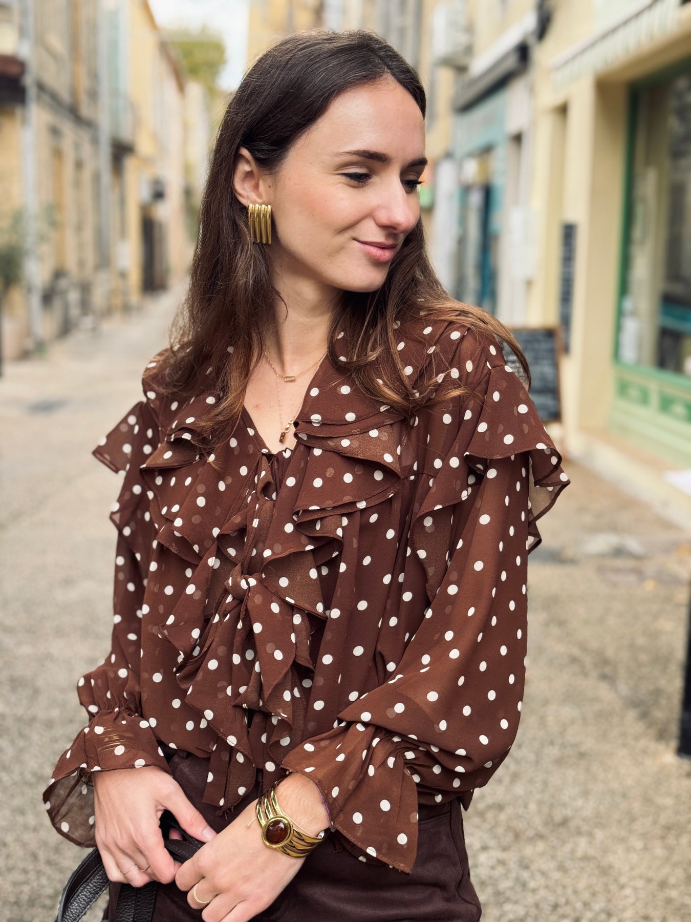 Blouse à pois marron chocolat, volants sur le devant et à nouer sur le col.