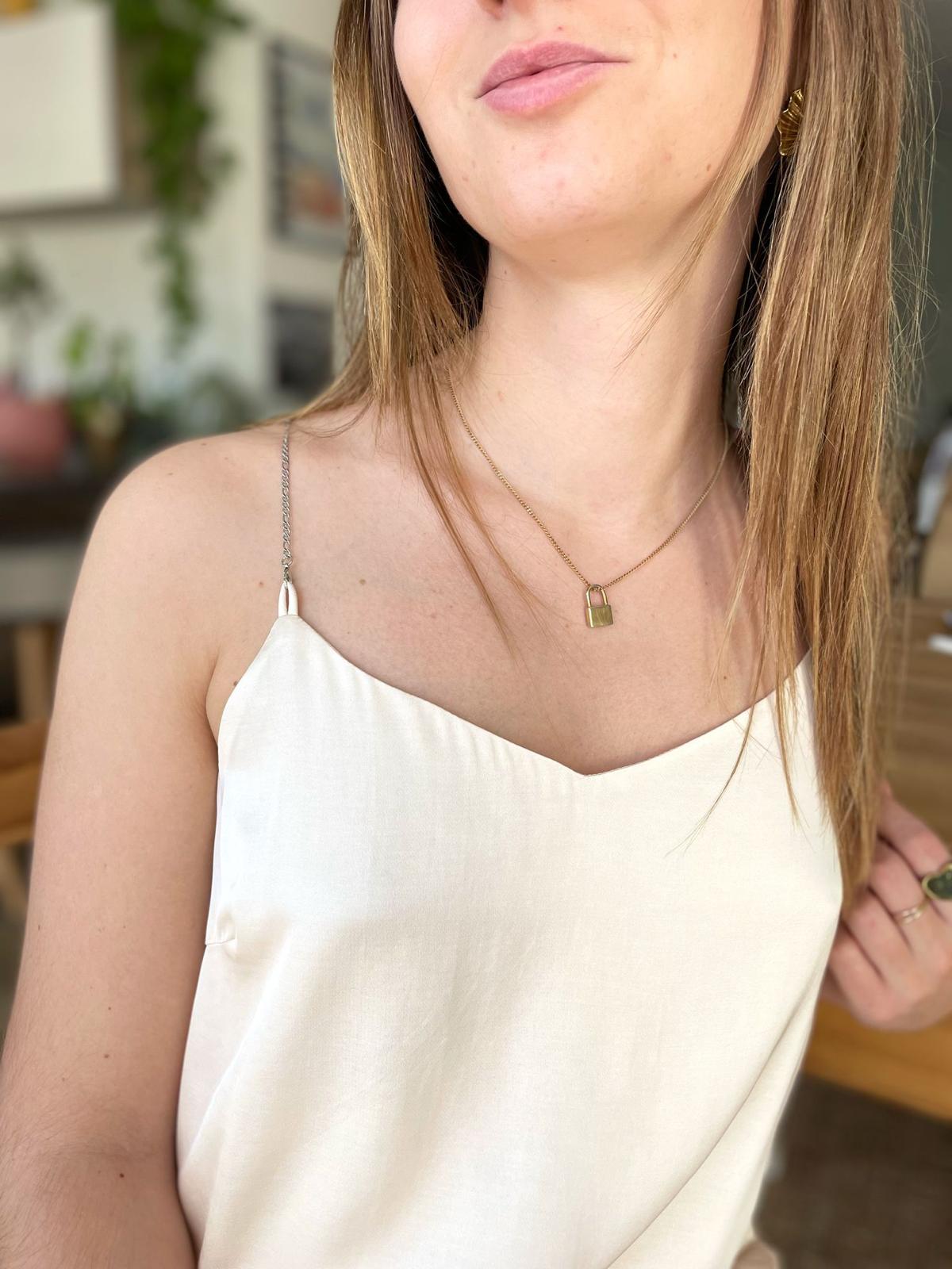 Débardeur satiné doublé avec des bretelles en chaînettes métalliques amovibles.