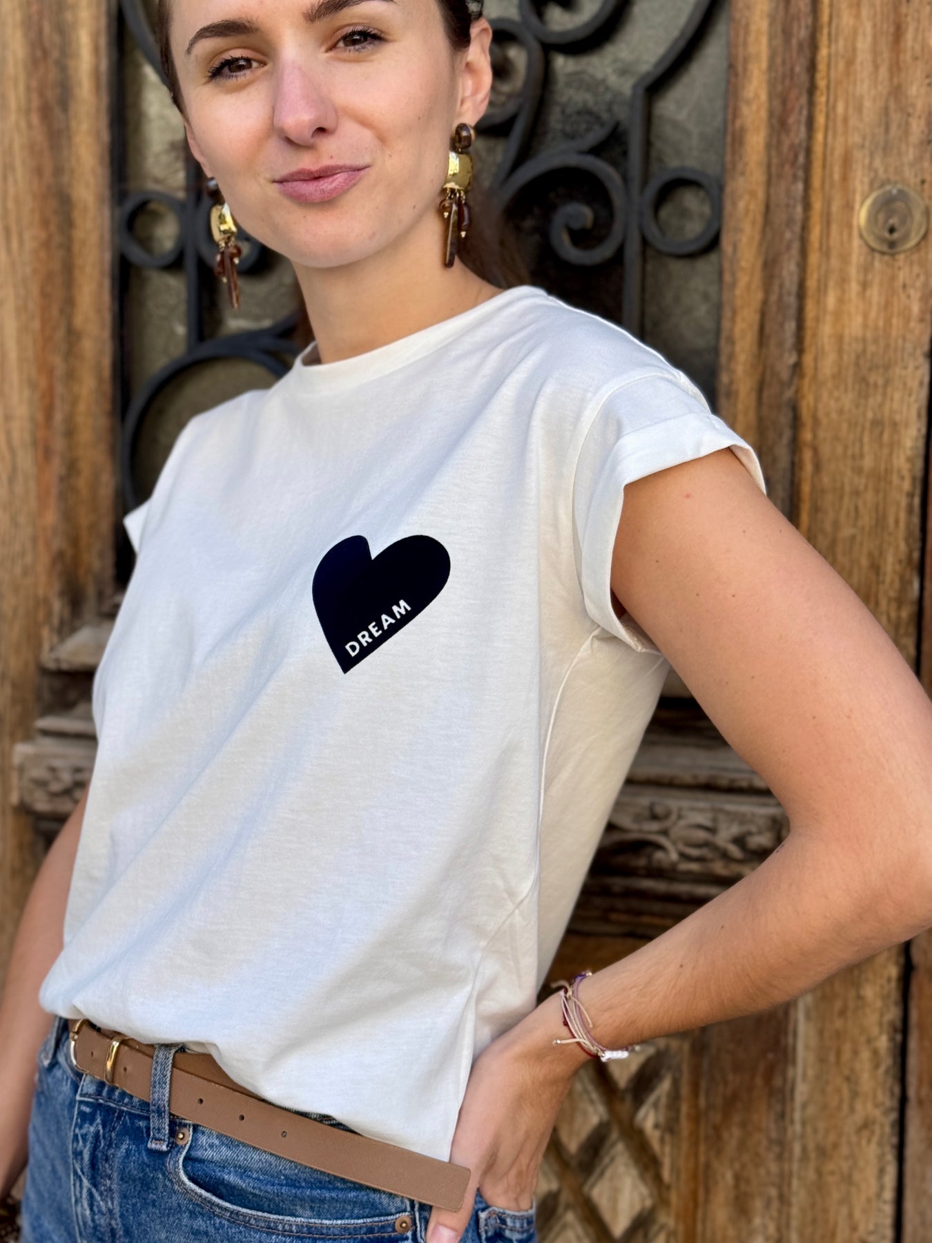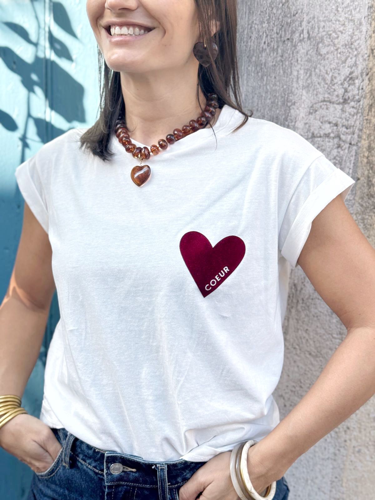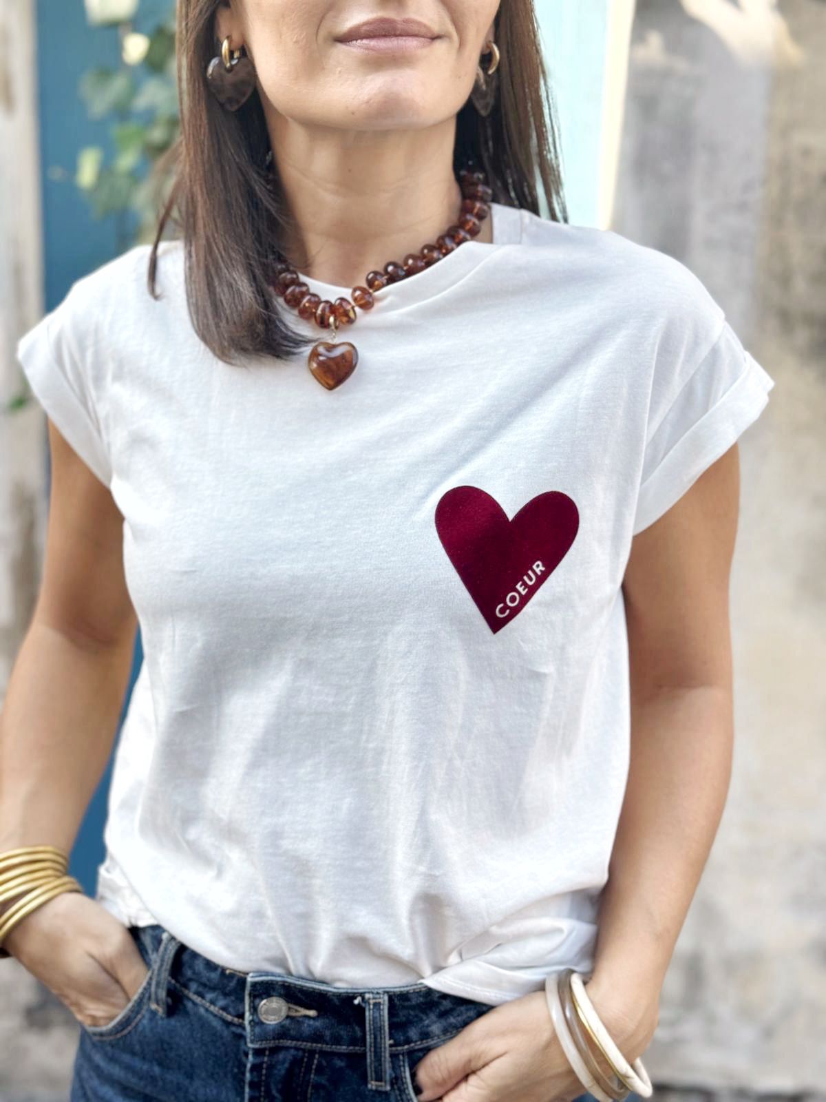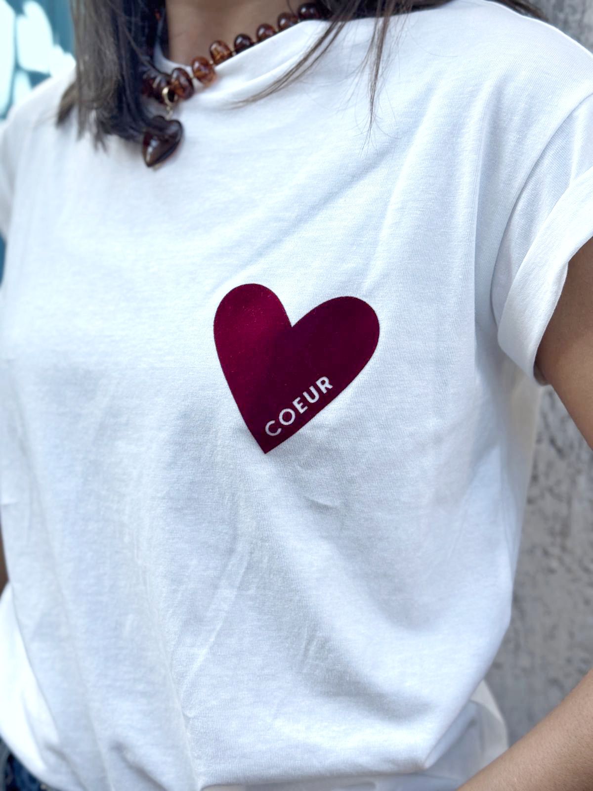 Tee shirt manches courtes blanc, coeur velours bordeaux
