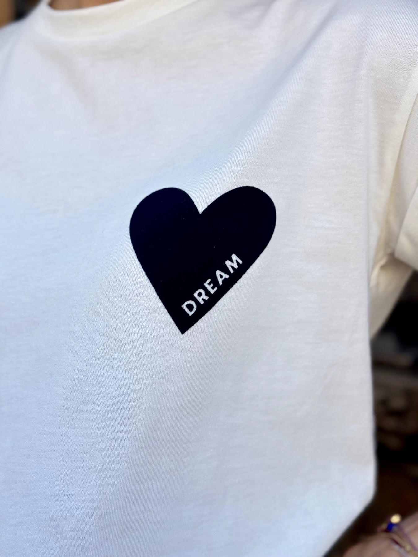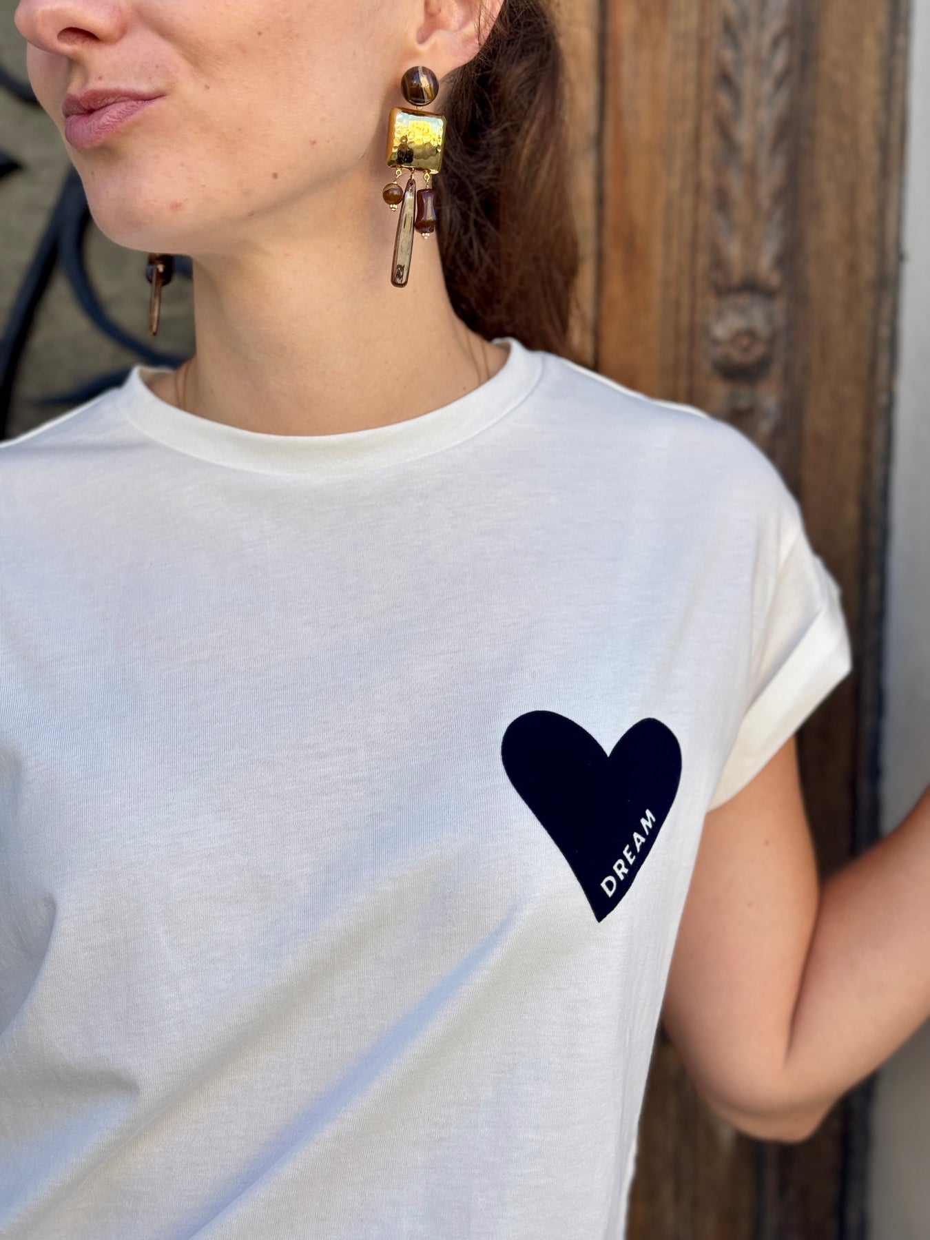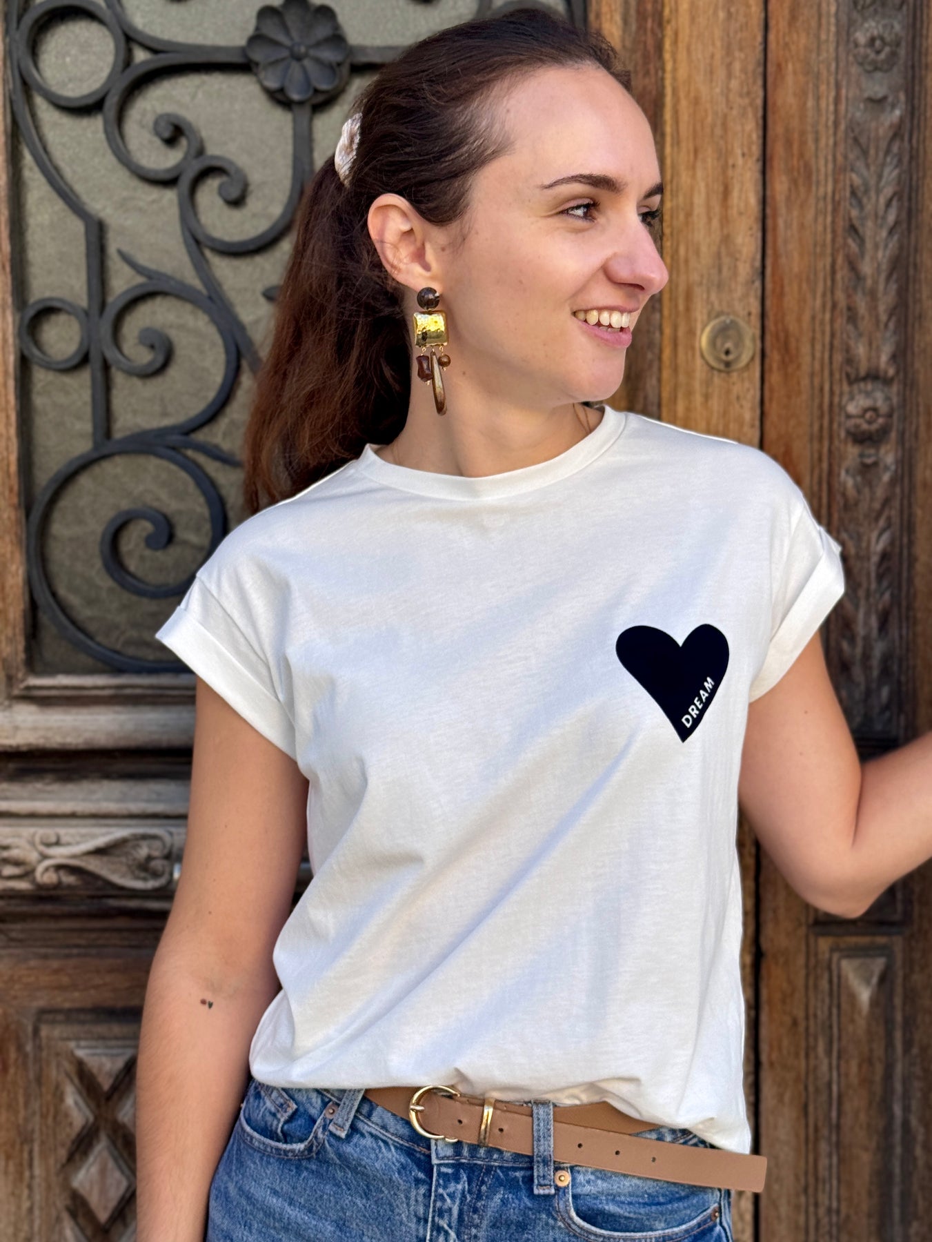 Tee shirt manches courtes blanc, coeur velours bleu marine