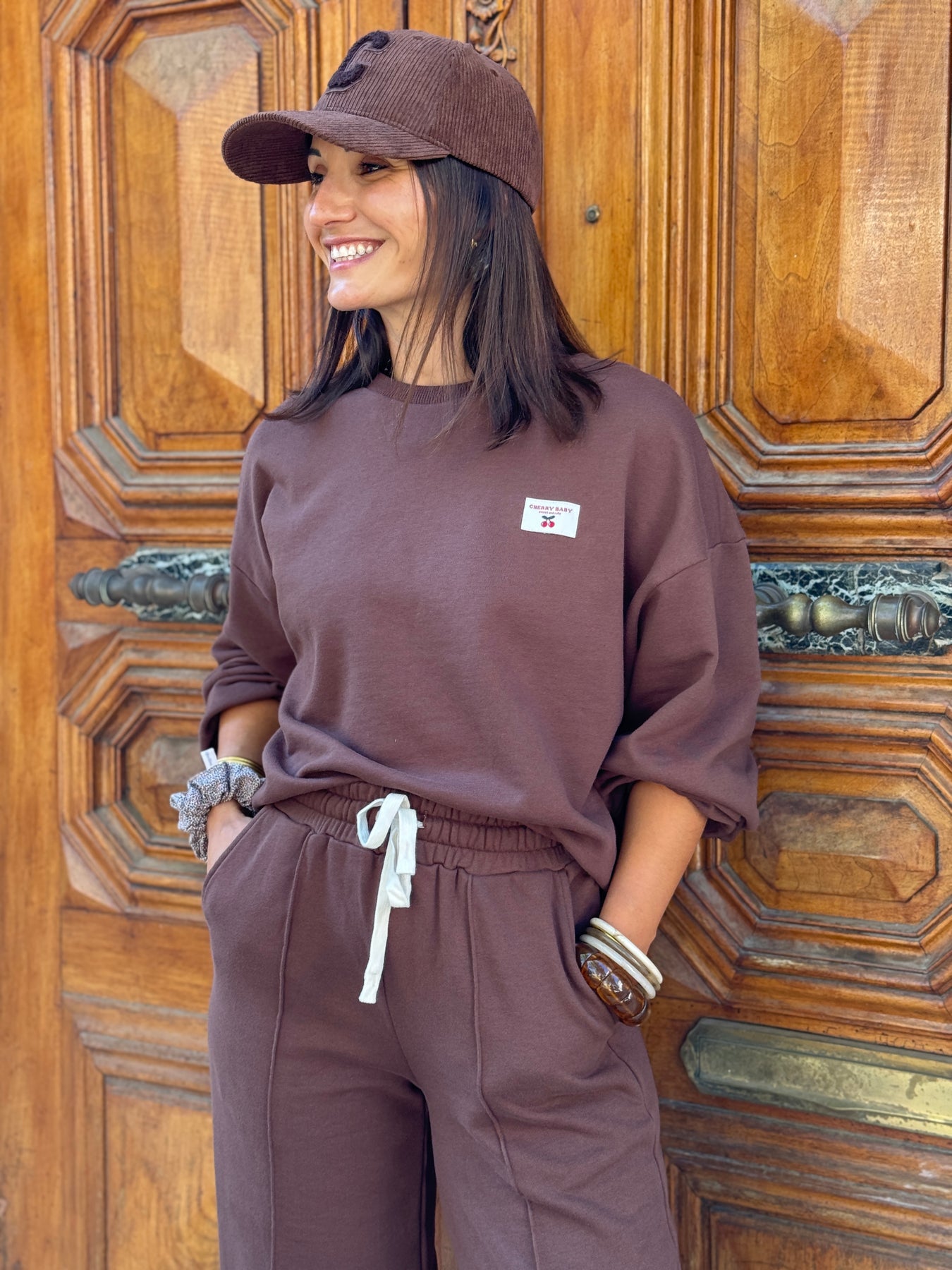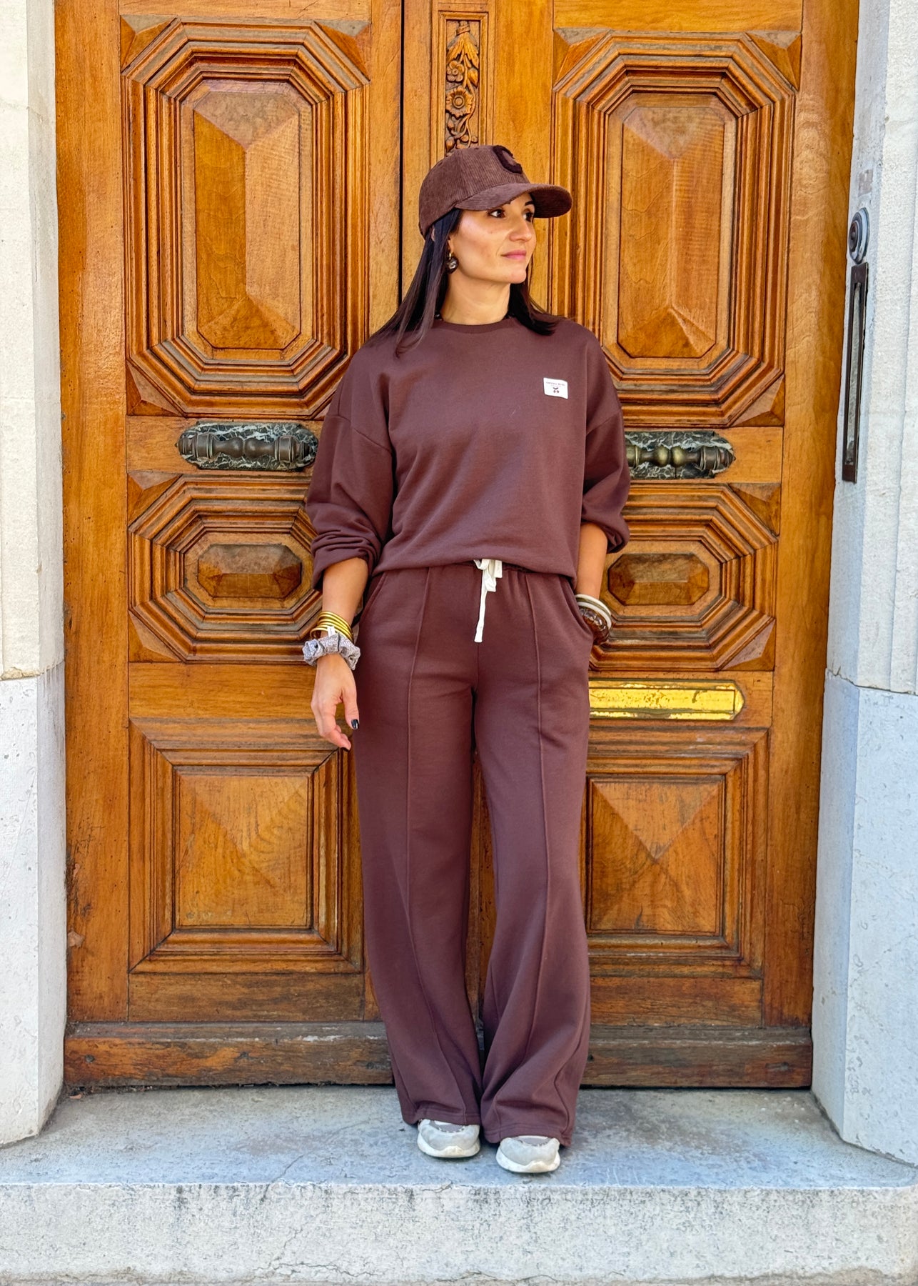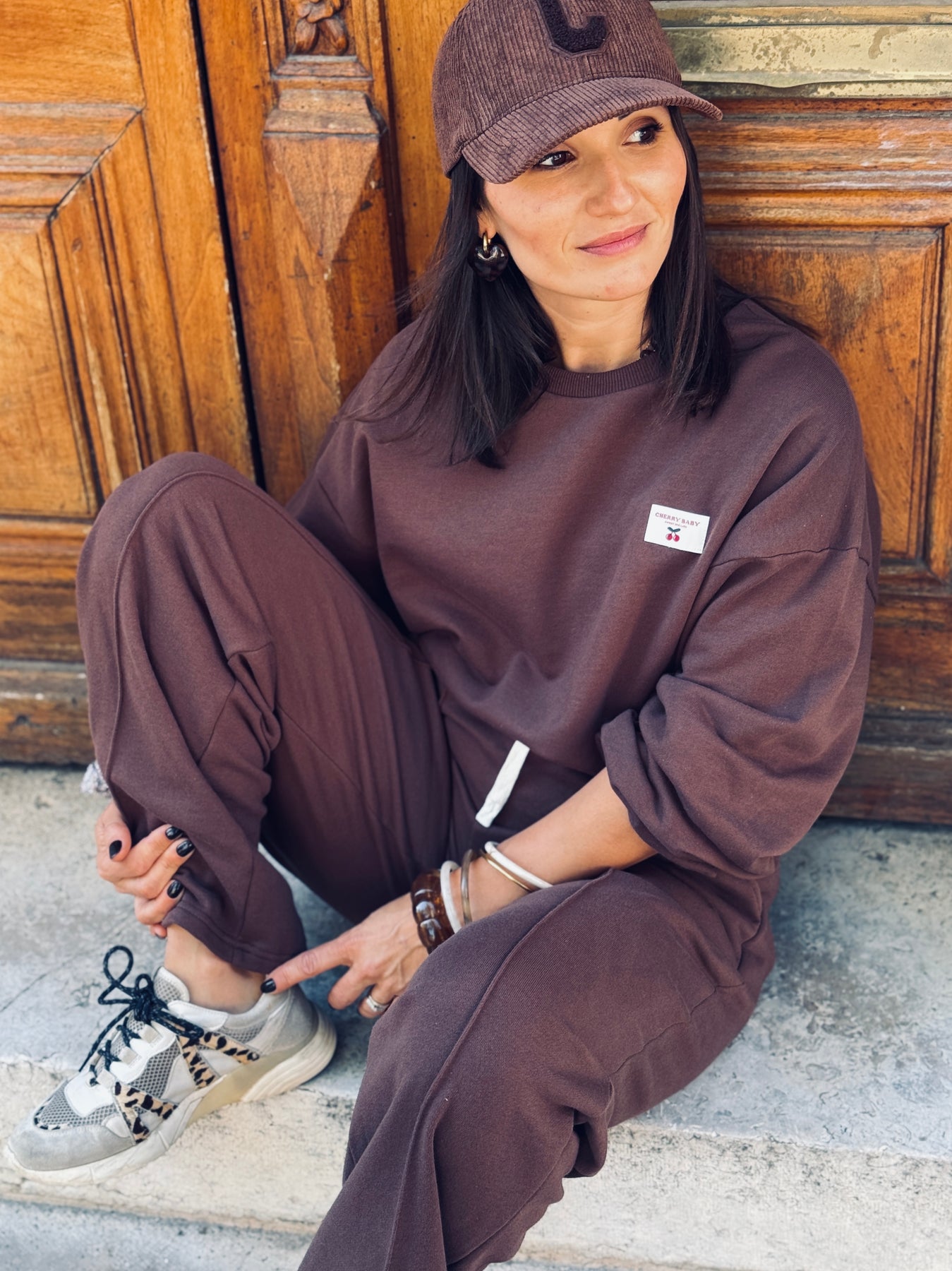 Ensemble Sweat (col rond, manches longues) + Pantalon jogging chocolat ( taille élastique, lien à resserrer, 2 poches )