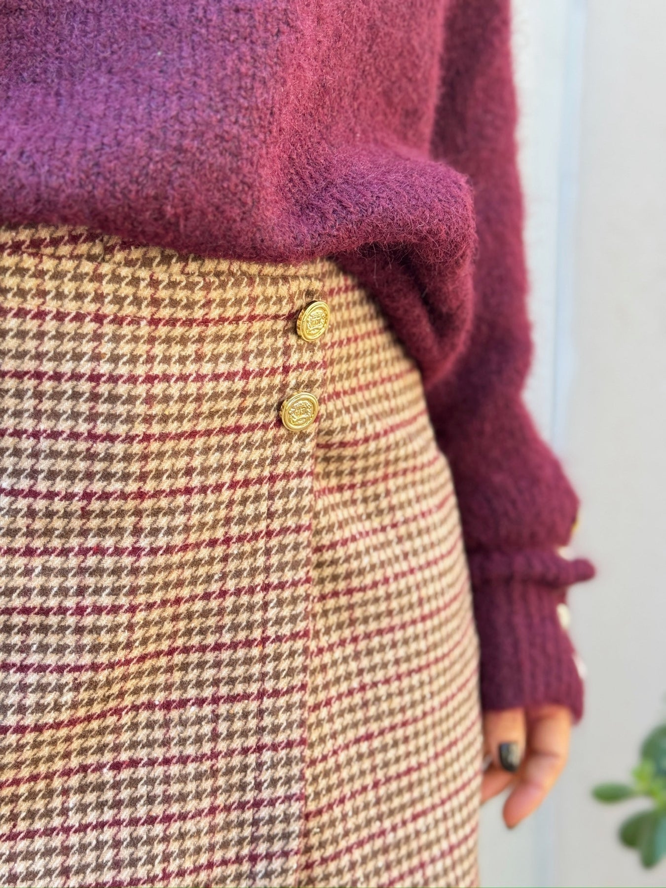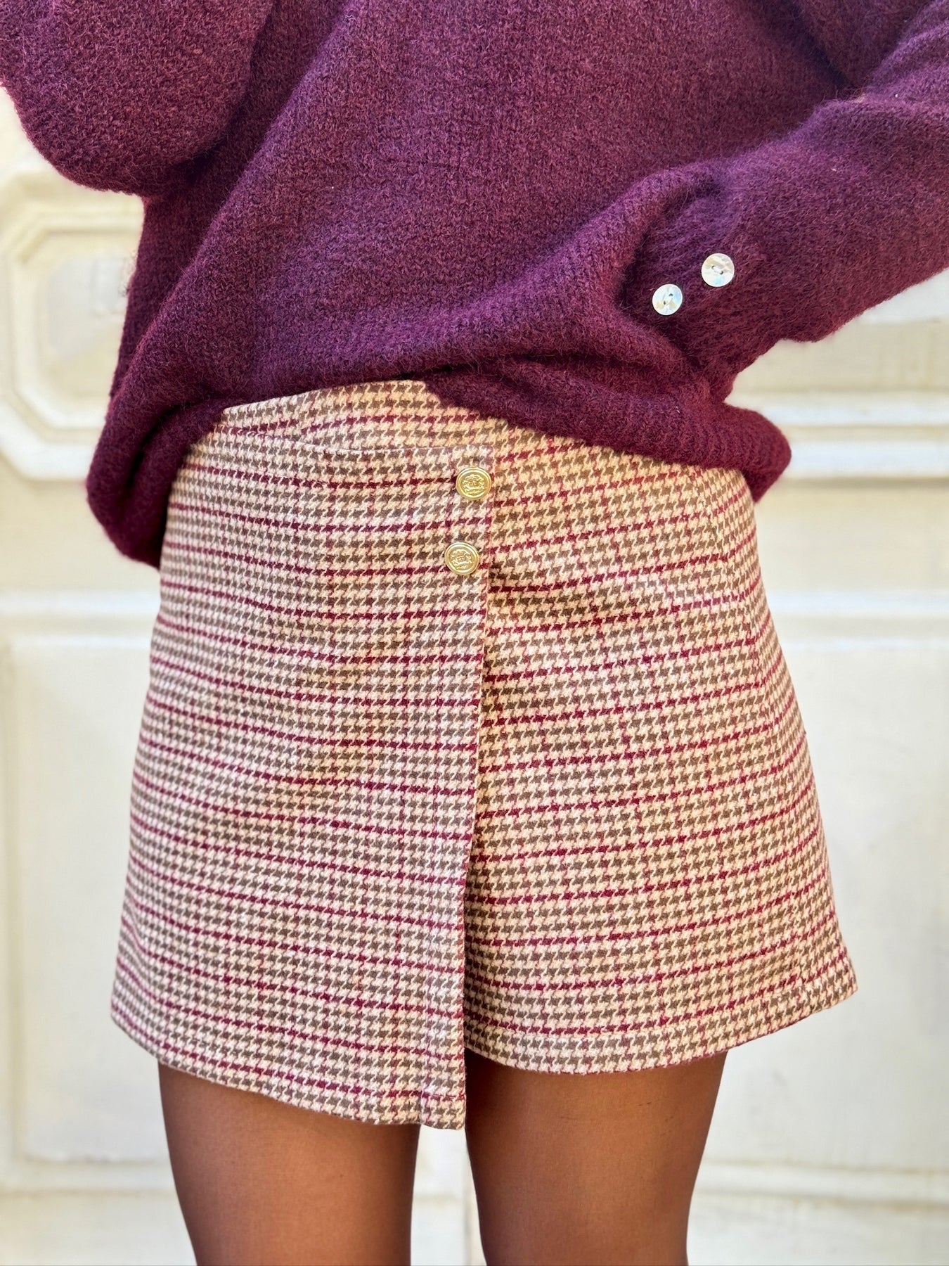Jupe short portefeuille, imprimé pied de poule bordeaux. Deux boutons dorés sur le devant. Fermeture éclair sur le côté.